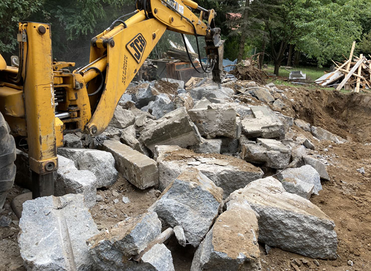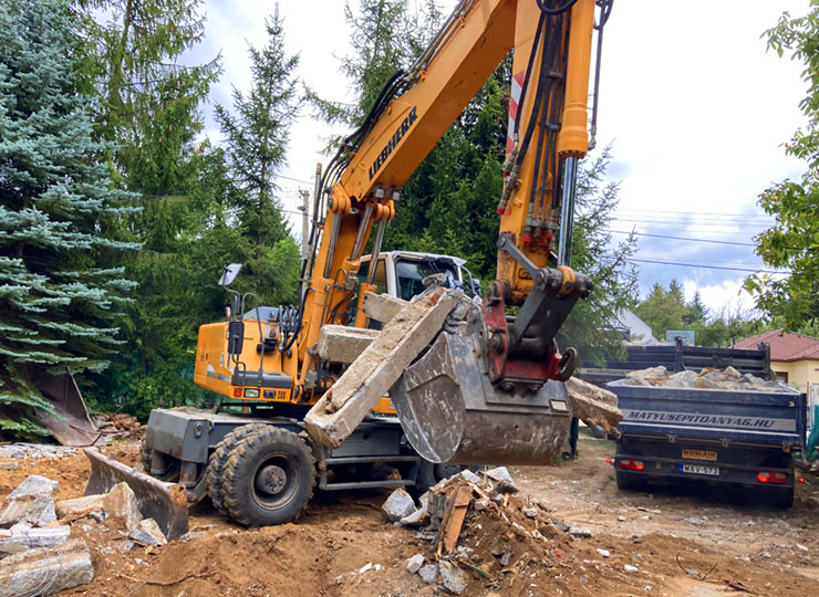 Épületek és alaptestek törőfejes bontása és elszállítása valamint tetőszerkezetek, nyílászárók és egyéb belső berendezések kézi bontása.