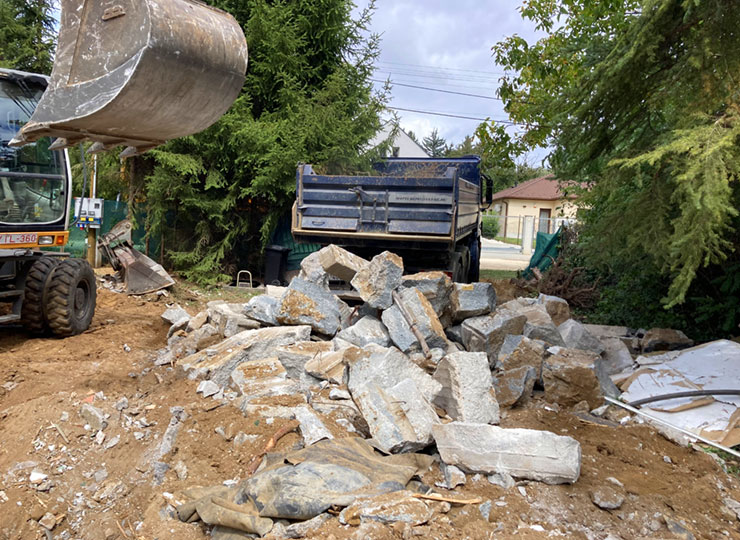 Pincetömbök, alaptestek anyagának géppel történő kiemelése, gépjárműre rakodása, valamint lerakóhelyre való szállítása.